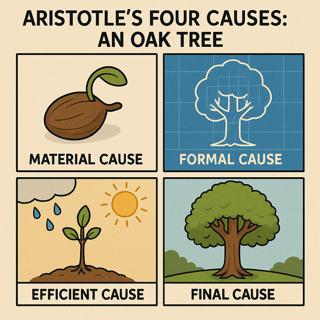 For the oak tree, the material cause is the acorn (from the earth; from below). The formal cause is the oak’s genetic blueprint or DNA — its “oakness” (from the Logos, from above). The efficient cause(s) are rain and sunlight, among other things (from behind), and the final cause is to grow, bear acorns, participate in the forest ecosystem, and fulfill its role in the larger order of life — to embody "oakness" in its highest form (from God’s will, from ahead).